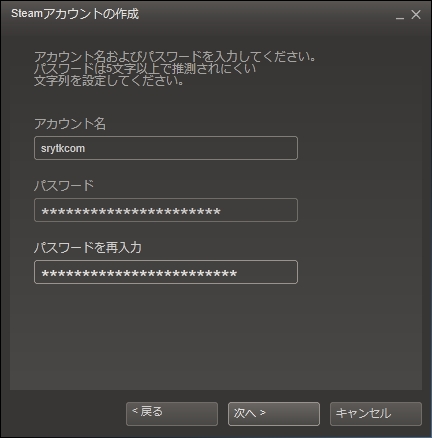 画像のように希望するアカウント名とパスワードを入力してください。パスワードは数字とアルファベットを組み合わせて決めるのをおすすめします。